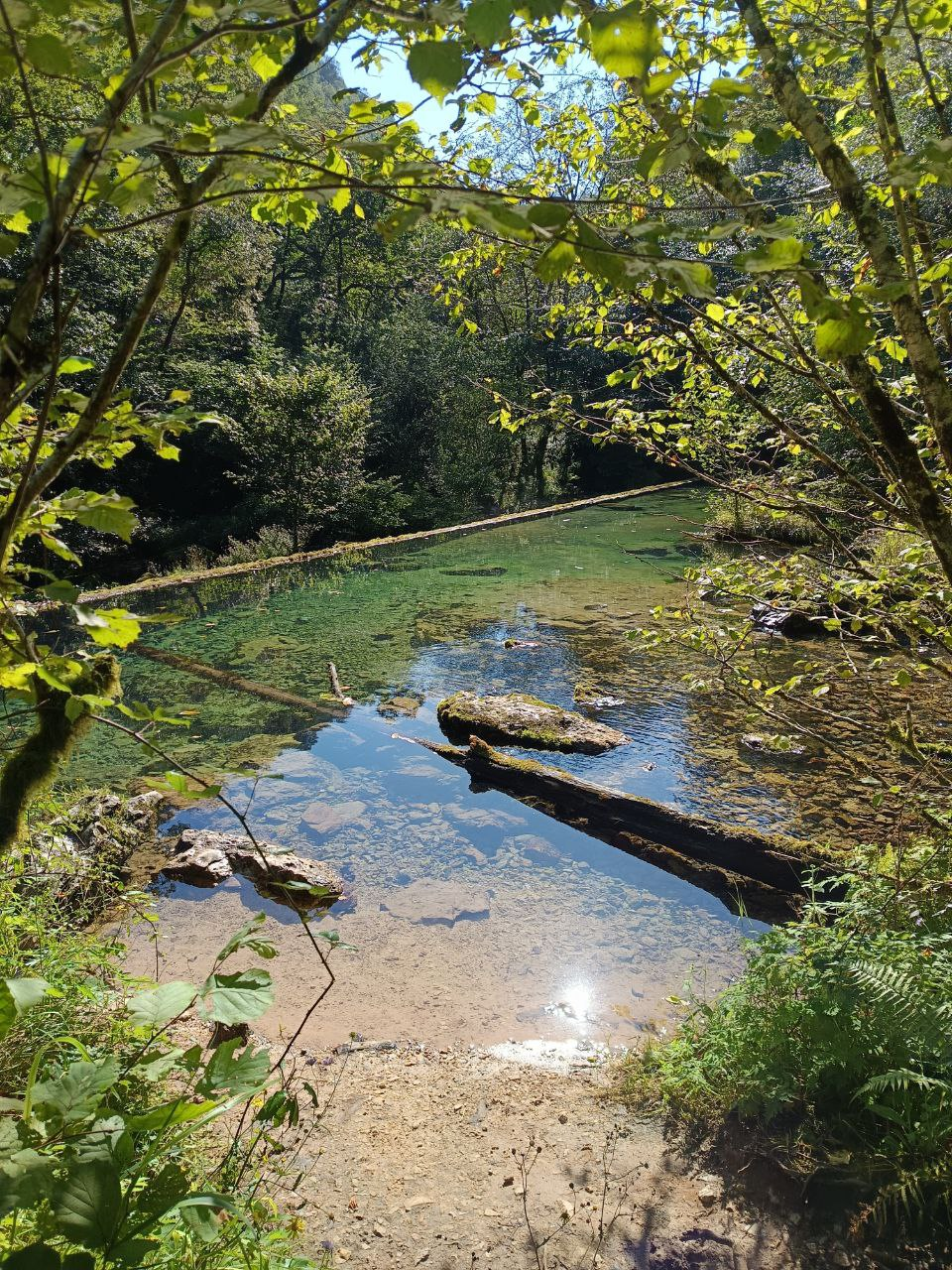 La senda sigue el curso del río, con tramos donde las paredes calizas se alzan a los lados 🪨 y zonas de bosque de ribera donde la vegetación es densa 🌳. El murmullo constante del agua acompaña la caminata 💦, junto al canto de pájaros y algún insecto que cruza el sendero 🐦. Hay tramos algo técnicos con piedras y raíces — conviene pisar con cuidado, sobre todo si está húmedo 👣.